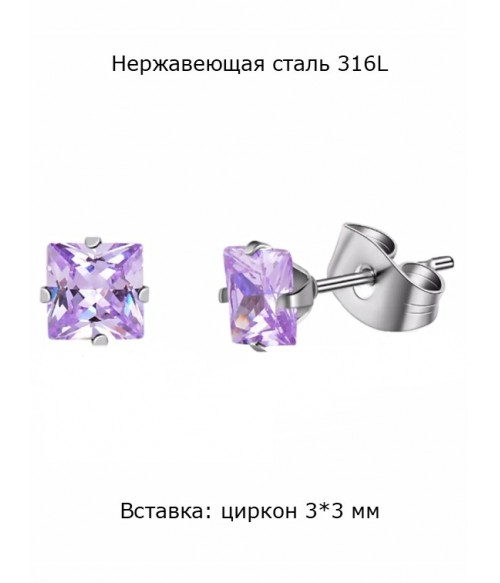 Серьги квадратные с цирконом фиолетовые 3 мм